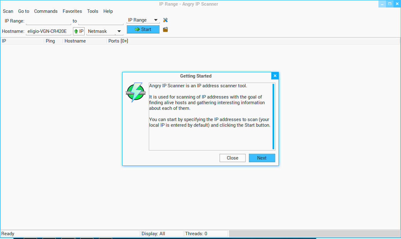 Janela “Getting Started” fornese informasaun konaba Angry IP Scanner, karik hakarak hatene liutan konaba aplikasaun refere bele klik deit ba butaun Next. Maibe karik atu sai no kontinua ba janela prinsipal Angry IP Scanner bele klik deit ba butaun Close.